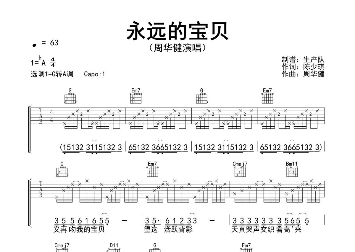 《永远的宝贝》是周华健演唱的一首歌曲,精编完美版,拍号为4/4拍,歌曲速度为每分钟63拍,歌曲原调为Ab调,但由于原调指法比较难,为了方便弹奏,本吉他谱采用的是G调指法编配,变调夹1品弹奏即为原调,当然也可以根据自己的音域改变变调夹位置,或者通过改变和弦调性,以方便自己弹奏,这份吉他谱共有三张高清图谱,图谱由 @生产队 编配上传,图谱使用六线谱编配,包含吉他和弦指法、简谱以及歌词部分,使用这份永远的宝贝吉他谱,可以让你更加方便地掌握这首歌曲的弹唱技巧,快来尝试吧。《永远的宝贝》是由陈少琪作词,周华健演唱的一首歌,收录于专辑《有弦相聚》中。本吉他谱根据原版G调转A调指法编配,完整的前奏、间奏、尾奏编配,怀旧经典!。