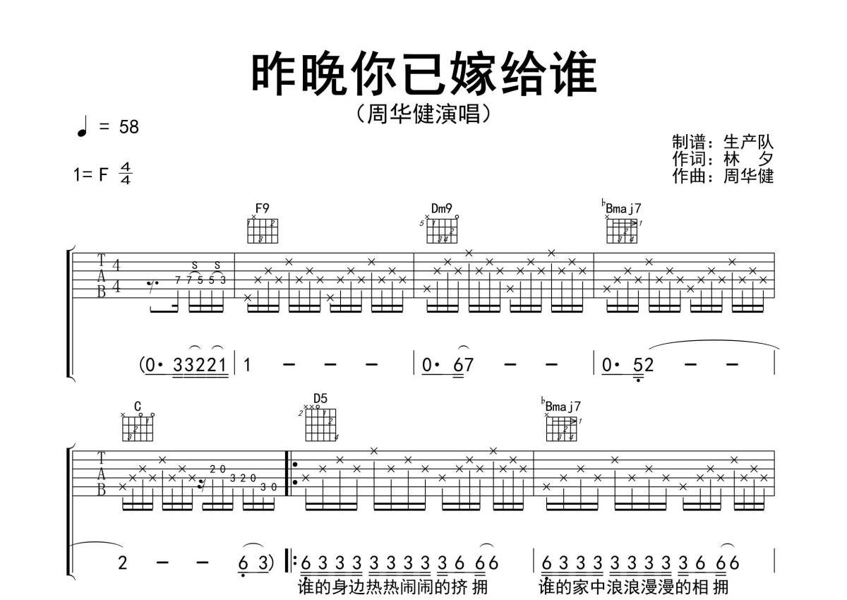 《昨晚你已嫁给谁》是周华健演唱的一首歌曲,精编完美版,拍号为4/4拍,歌曲速度为每分钟58拍,歌曲原调为F调,但由于原调指法比较难,为了方便弹奏,本吉他谱采用的是F调指法编配,演奏时不需要使用变调夹即为原调,这份吉他谱共有三张高清图谱,图谱由 @生产队 编配上传,图谱使用六线谱编配,包含吉他和弦指法、简谱以及歌词部分,使用这份昨晚你已嫁给谁吉他谱,可以让你更加方便地掌握这首歌曲的弹唱技巧,快来尝试吧。《昨晚你已嫁给谁》是由林夕作词,周华健作曲并演唱的一首歌,收录于专辑《有弦相聚》中。本吉他谱根据原版F调指法编配,精准的前奏、间奏、尾奏及SOLO编配,怀旧经典!。