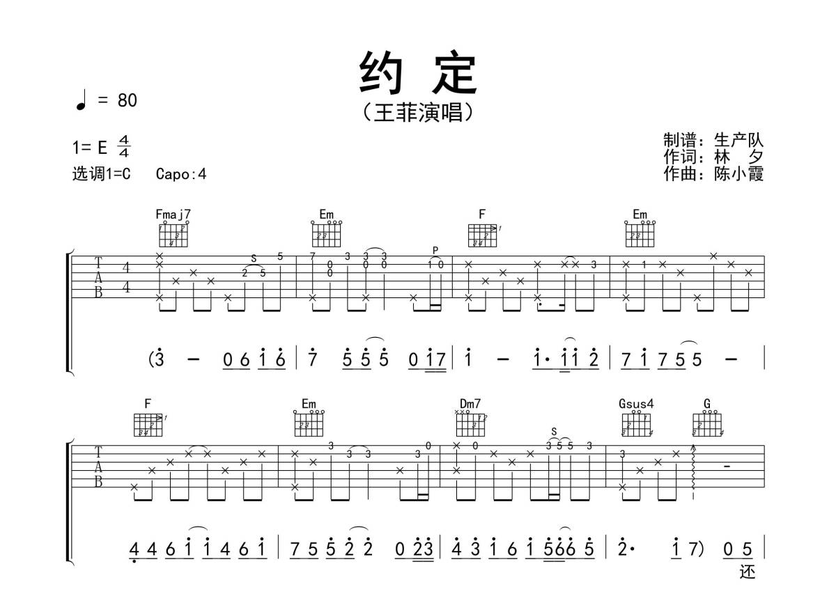 《约定》是王菲演唱的一首歌曲,精编完美版,拍号为4/4拍,歌曲速度为每分钟80拍,歌曲原调为E调,但由于原调指法比较难,为了方便弹奏,本吉他谱采用的是C调指法编配,变调夹4品弹奏即为原调,当然也可以根据自己的音域改变变调夹位置,或者通过改变和弦调性,以方便自己弹奏,这份吉他谱共有三张高清图谱,图谱由 @生产队 编配上传,图谱使用六线谱编配,包含吉他和弦指法、简谱以及歌词部分,使用这份约定吉他谱,可以让你更加方便地掌握这首歌曲的弹唱技巧,快来尝试吧。《约定》是由林夕作词、陈小霞作曲,王菲演唱的歌曲,收录于王菲1997年发行的EP《玩具》中 ,该曲获得香港商业电台叱咤903专业推介歌曲奖;林夕则凭借该曲获得第20届十大中文金曲最佳中文流行歌词奖 。本吉他谱根据原版C调指法编配,完整的前奏、间奏、尾奏编配,怀旧经典!。
