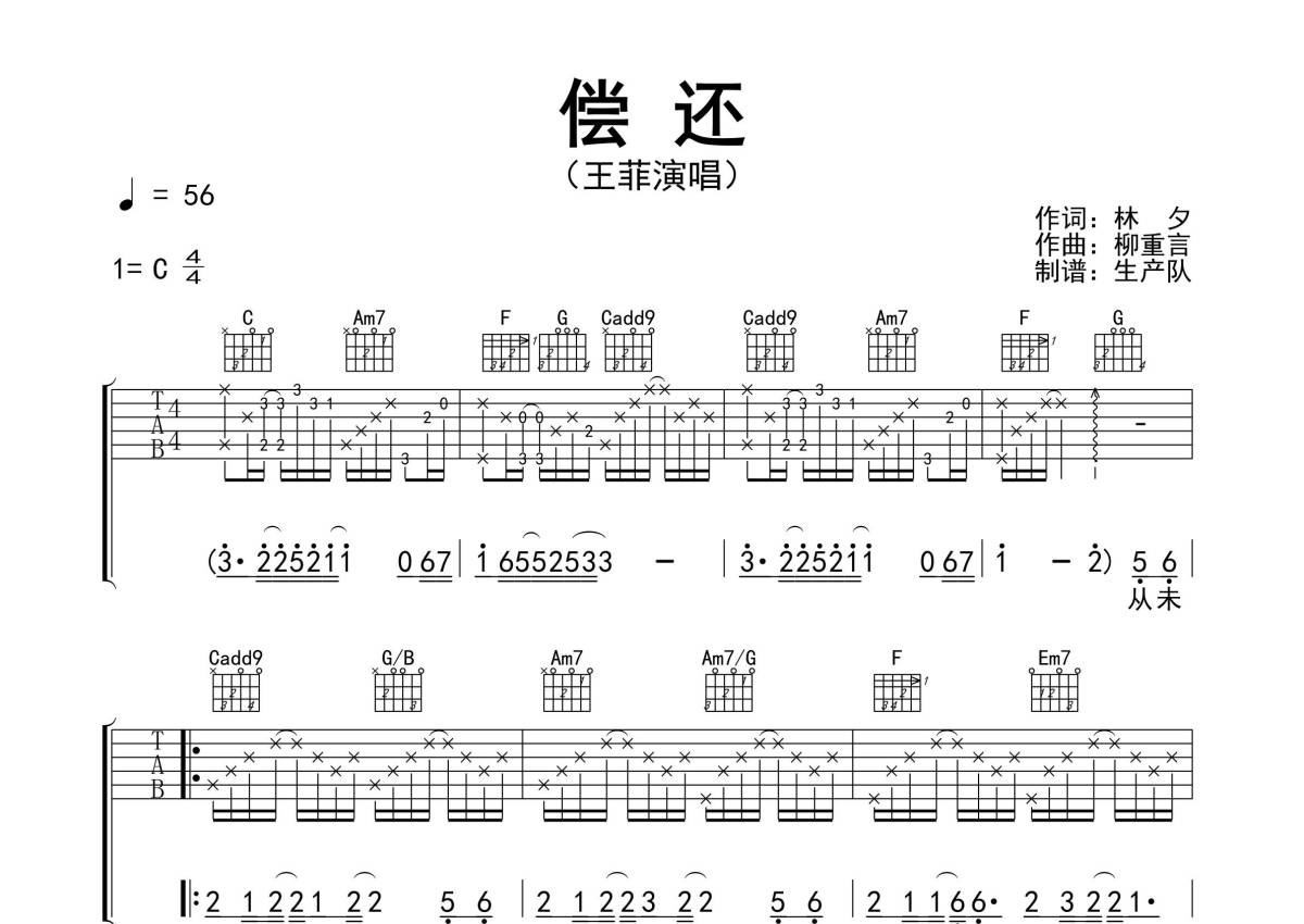 《偿还》是王菲演唱的一首歌曲,精编完美版,拍号为4/4拍,歌曲速度为每分钟56拍,歌曲原调为C调,本吉他谱采用的是C调指法编配,演奏时不需要使用变调夹即为原调,这份吉他谱共有三张高清图谱,图谱由 @生产队 编配上传,图谱使用六线谱编配,包含吉他和弦指法、简谱以及歌词部分,使用这份偿还吉他谱,可以让你更加方便地掌握这首歌曲的弹唱技巧,快来尝试吧。《偿还》是王菲演唱的粤语歌曲,由林夕作词、柳重言作曲,收录于王菲1998年发行的专辑《唱游》中。本吉他谱根据原版C调指法编配,完整的前奏、间奏、尾奏及SOLO编配,怀旧经典!。