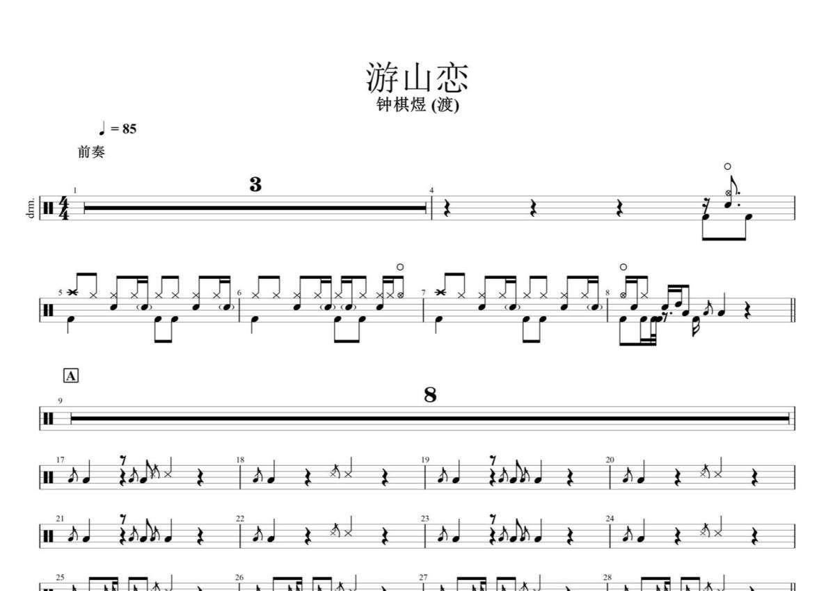 《游山恋》是钟棋煜演唱的一首歌曲,拍号为4/4拍,歌曲速度为每分钟85拍,这份架子鼓谱共有两张高清图谱,图谱由 @小东鼓谱 编配上传,图谱使用五线谱编配,使用这份游山恋架子鼓谱,你将能够轻松地敲打出这首钟棋煜的游山恋,快来尝试吧。