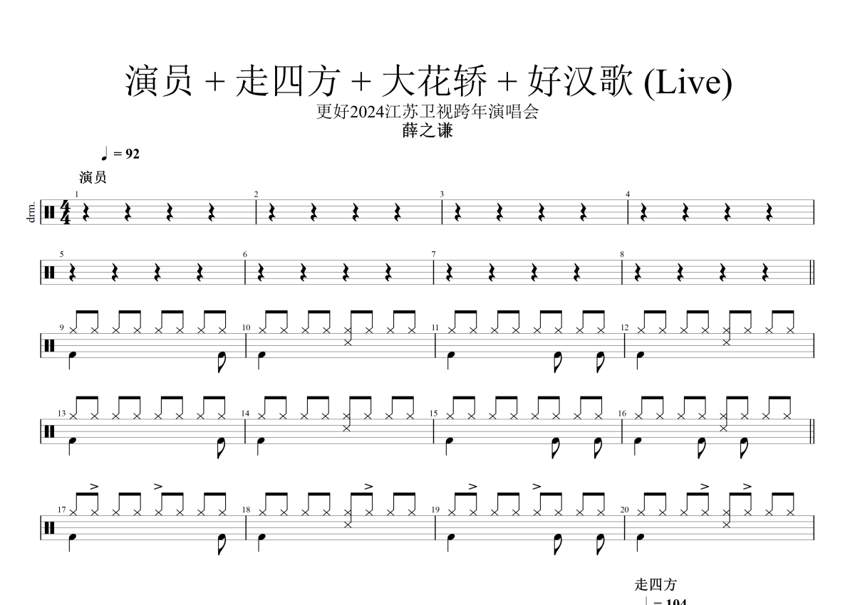 薛之谦《演员+走四方+大花轿+好汉歌Live》架子鼓谱