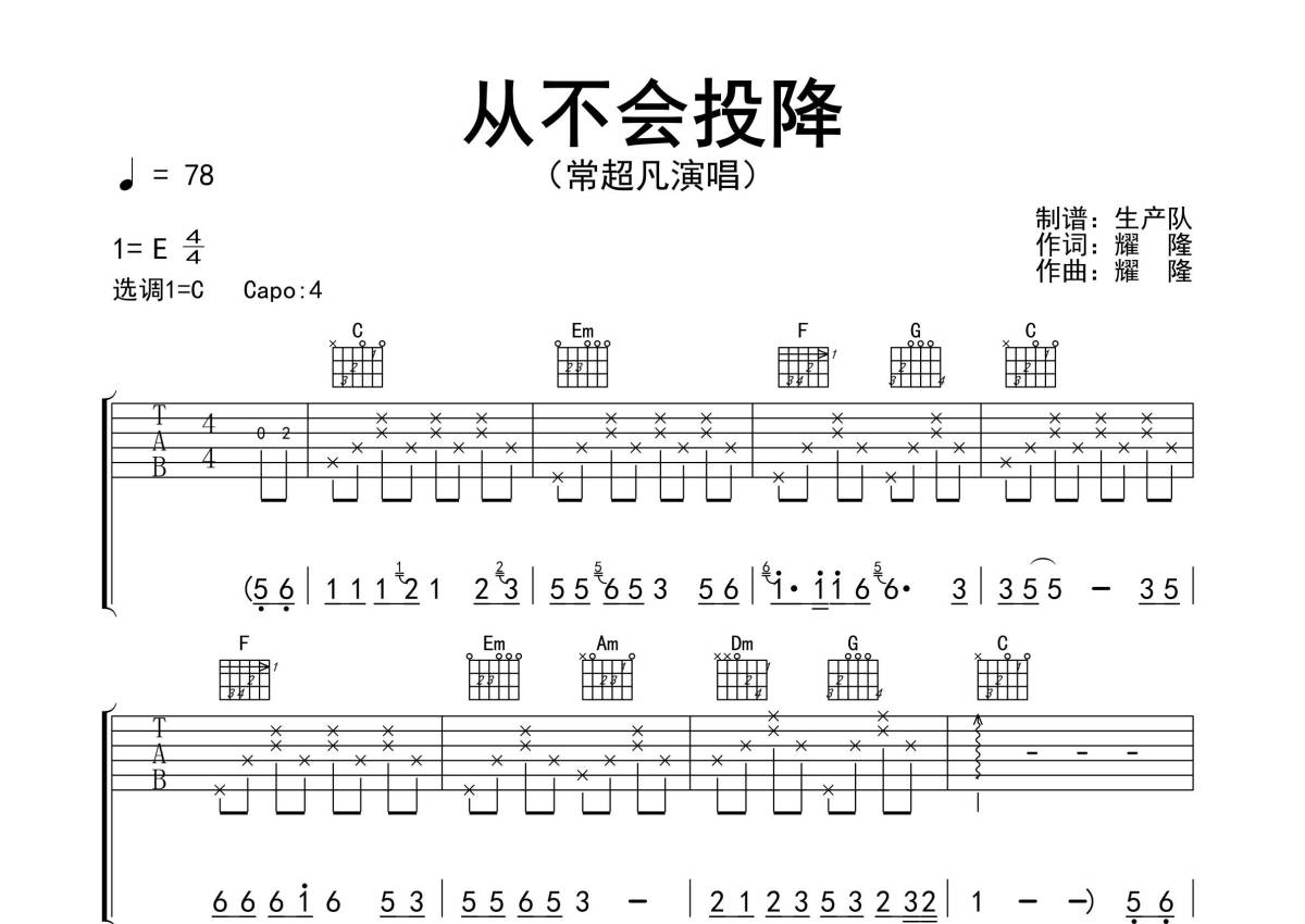 《从不会投降》是常超凡演唱的一首歌曲,精编完美版,拍号为4/4拍,歌曲速度为每分钟78拍,歌曲原调为E调,但由于原调指法比较难,为了方便弹奏,本吉他谱采用的是C调指法编配,变调夹4品弹奏即为原调,当然也可以根据自己的音域改变变调夹位置,或者通过改变和弦调性,以方便自己弹奏,这份吉他谱共有三张高清图谱,图谱由 @生产队 编配上传,图谱使用六线谱编配,包含吉他和弦指法、简谱以及歌词部分,使用这份从不会投降吉他谱,可以让你更加方便地掌握这首歌曲的弹唱技巧,快来尝试吧。《从不会投降》是由常超凡演唱的一首充满力量和决心的歌曲。本吉他谱根据原版C调指法编配,精准的前奏、间奏、尾奏和SOLO编配,值得推荐!。