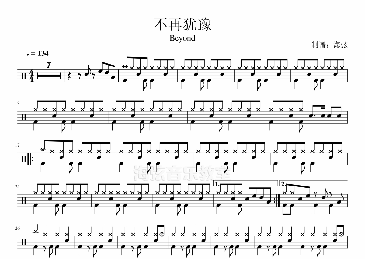 《不再犹豫》是BEYOND演唱的一首歌曲,拍号为4/4拍,歌曲速度为每分钟134拍,这份架子鼓谱共有两张高清图谱,图谱由 @海弦 编配上传,图谱使用五线谱编配,使用这份不再犹豫架子鼓谱,你将能够轻松地敲打出这首BEYOND的不再犹豫,快来尝试吧。