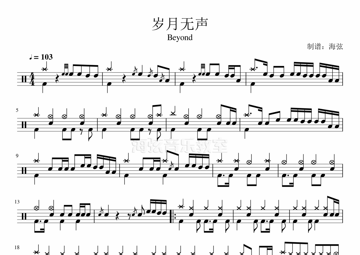 《岁月无声》是Beyond演唱的一首歌曲,拍号为4/4拍,歌曲速度为每分钟103拍,这份架子鼓谱共有两张高清图谱,图谱由 @海弦 编配上传,图谱使用五线谱编配,使用这份岁月无声架子鼓谱,你将能够轻松地敲打出这首Beyond的岁月无声,快来尝试吧。