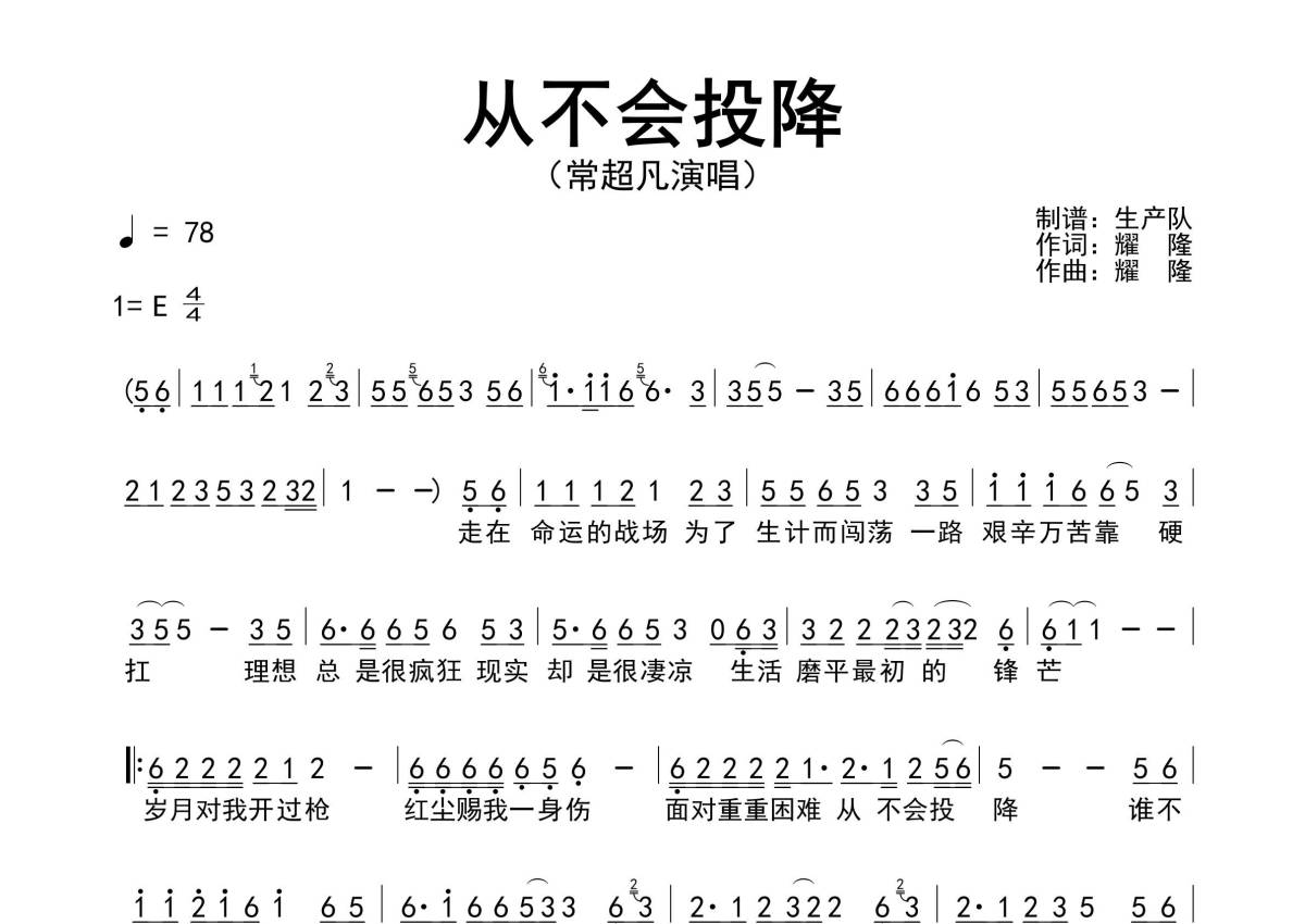 《从不会投降》是常超凡演唱的一首歌曲,精编版,拍号为4/4拍,歌曲速度为每分钟78拍,这份简谱共有一张高清图谱,图谱由 @生产队 编配上传《从不会投降》是由常超凡演唱的一首充满力量和决心的歌曲。本吉他谱根据原版E调指法编配,精准的前奏、间奏、尾奏和SOLO编配,值得推荐!。