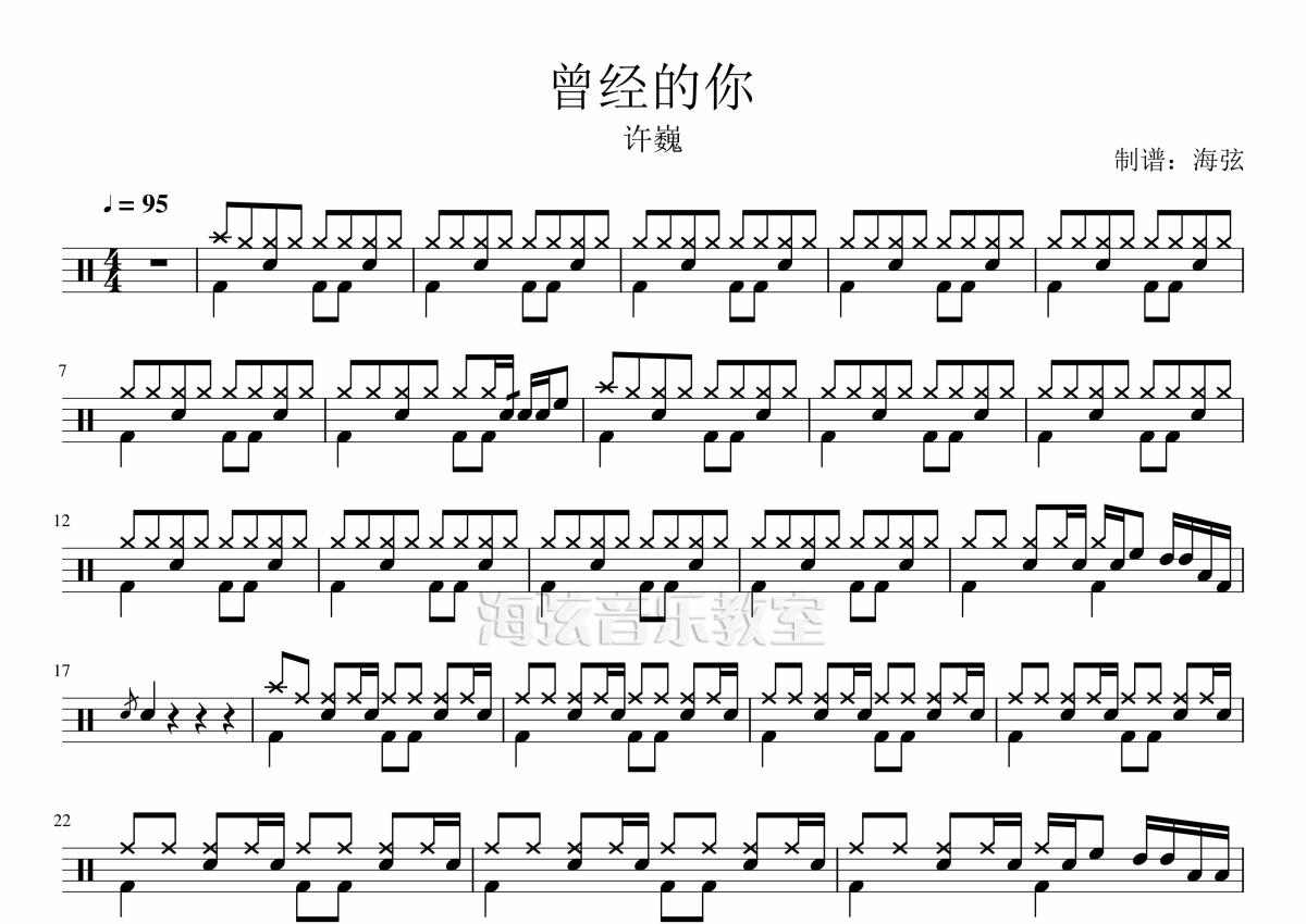 《曾经的你》是许巍演唱的一首歌曲,拍号为4/4拍,歌曲速度为每分钟95拍,这份架子鼓谱共有两张高清图谱,图谱由 @海弦 编配上传,图谱使用五线谱编配,使用这份曾经的你架子鼓谱,你将能够轻松地敲打出这首许巍的曾经的你,快来尝试吧。