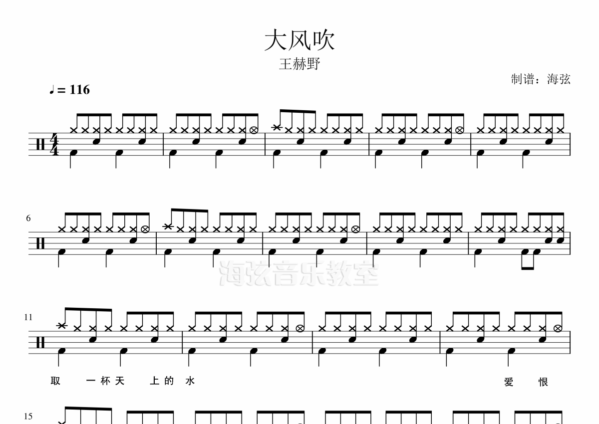 《大风吹》是王赫野/刘惜君演唱的一首歌曲,拍号为4/4拍,歌曲速度为每分钟116拍,这份架子鼓谱共有两张高清图谱,图谱由 @海弦 编配上传,图谱使用五线谱编配,使用这份大风吹架子鼓谱,你将能够轻松地敲打出这首王赫野/刘惜君的大风吹,快来尝试吧。