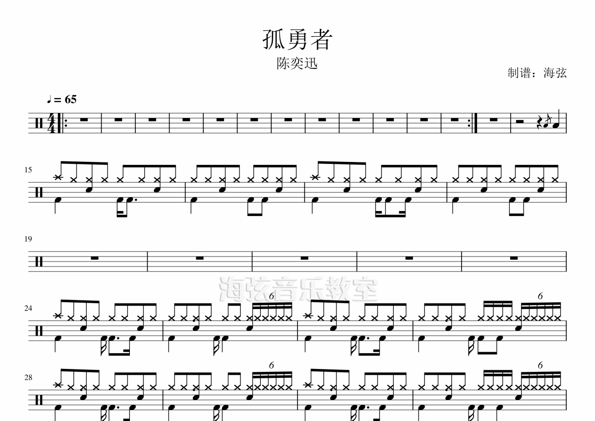 《孤勇者》是陈奕迅演唱的一首歌曲,拍号为4/4拍,歌曲速度为每分钟65拍,这份架子鼓谱共有一张高清图谱,图谱由 @海弦 编配上传,图谱使用五线谱编配,使用这份孤勇者架子鼓谱,你将能够轻松地敲打出这首陈奕迅的孤勇者,快来尝试吧。