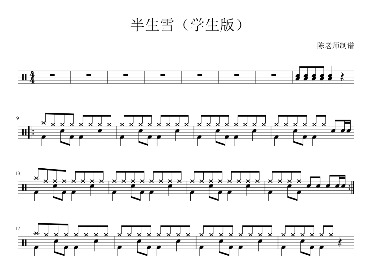 《半生雪》是学生版演唱的一首歌曲,学生版,拍号为4/4拍,这份架子鼓谱共有一张高清图谱,图谱由 @陈老师 编配上传,图谱使用五线谱编配,使用这份半生雪架子鼓谱,你将能够轻松地敲打出这首学生版的半生雪,快来尝试吧。