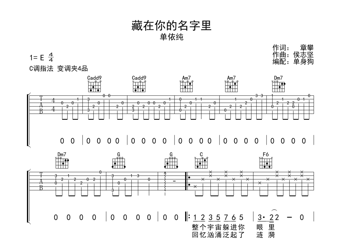 《藏在你的名字里》是单依纯演唱的一首歌曲,拍号为4/4拍,歌曲原调为E调,但由于原调指法比较难,为了方便弹奏,本吉他谱采用的是C调指法编配,变调夹4品弹奏即为原调,当然也可以根据自己的音域改变变调夹位置,或者通过改变和弦调性,以方便自己弹奏,这份吉他谱共有两张高清图谱,图谱由 @单身狗 编配上传,图谱使用六线谱编配,包含吉他和弦指法、简谱以及歌词部分,使用这份藏在你的名字里吉他谱,可以让你更加方便地掌握这首歌曲的弹唱技巧,快来尝试吧。