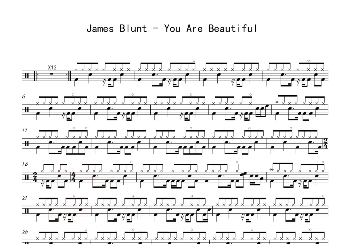 《You're Beautiful》是James Blunt演唱的一首歌曲,这份鼓谱共有一张高清图谱,图谱由 @打鼓谱 编配上传,图谱使用五线谱编配,使用这份You're Beautiful架子鼓谱,你将能够轻松地敲打出这首James Blunt的You're Beautiful,快来尝试吧。《You're Beautiful》是英国歌手詹姆斯·布朗特演唱的歌曲,由詹姆斯·布朗特、萨夏·斯卡尔贝克、阿曼达·苟斯特填词谱曲,收录在詹姆斯·布朗特首张录音室专辑《Back To Bedlam》中,于2005年5月30日作为专辑的第三支单曲发布 。