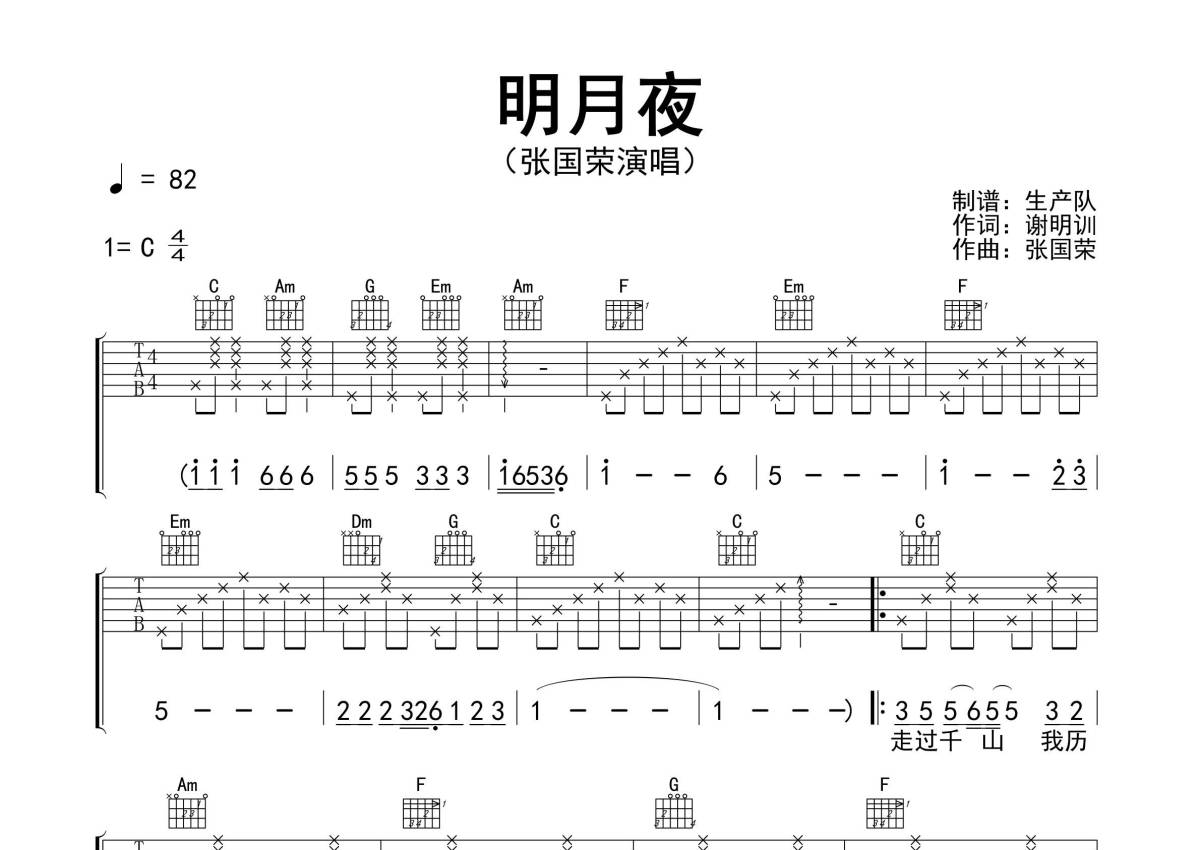 《明月夜》是张国荣演唱的一首歌曲,精编完美版,拍号为4/4拍,歌曲速度为每分钟82拍,歌曲原调为C调,本吉他谱采用的是C调指法编配,演奏时不需要使用变调夹即为原调,这份吉他谱共有两张高清图谱,图谱由 @生产队 编配上传,图谱使用六线谱编配,包含吉他和弦指法、简谱以及歌词部分,使用这份明月夜吉他谱,可以让你更加方便地掌握这首歌曲的弹唱技巧,快来尝试吧。《明月夜》是张国荣于1989年演唱的一首普通话歌曲,收录于专辑《兜风心情》中。本吉他谱根据原版C调指法编配,怀旧经典!。