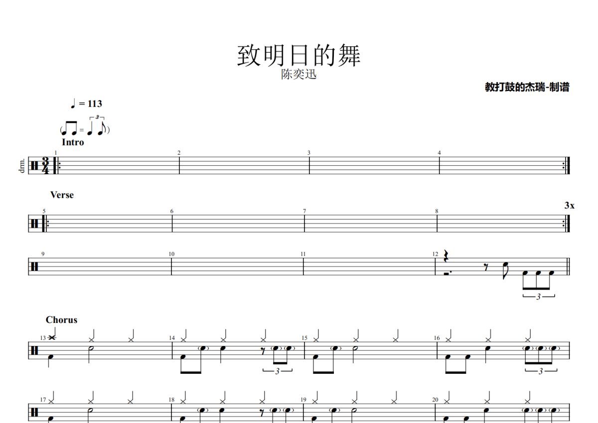 《致明日的舞》是陈奕迅演唱的一首歌曲,拍号为3/4拍,歌曲速度为每分钟113拍,这份架子鼓谱共有三张高清图谱,图谱由 @Jerry 编配上传,图谱使用五线谱编配,使用这份致明日的舞架子鼓谱,你将能够轻松地敲打出这首陈奕迅的致明日的舞,快来尝试吧。