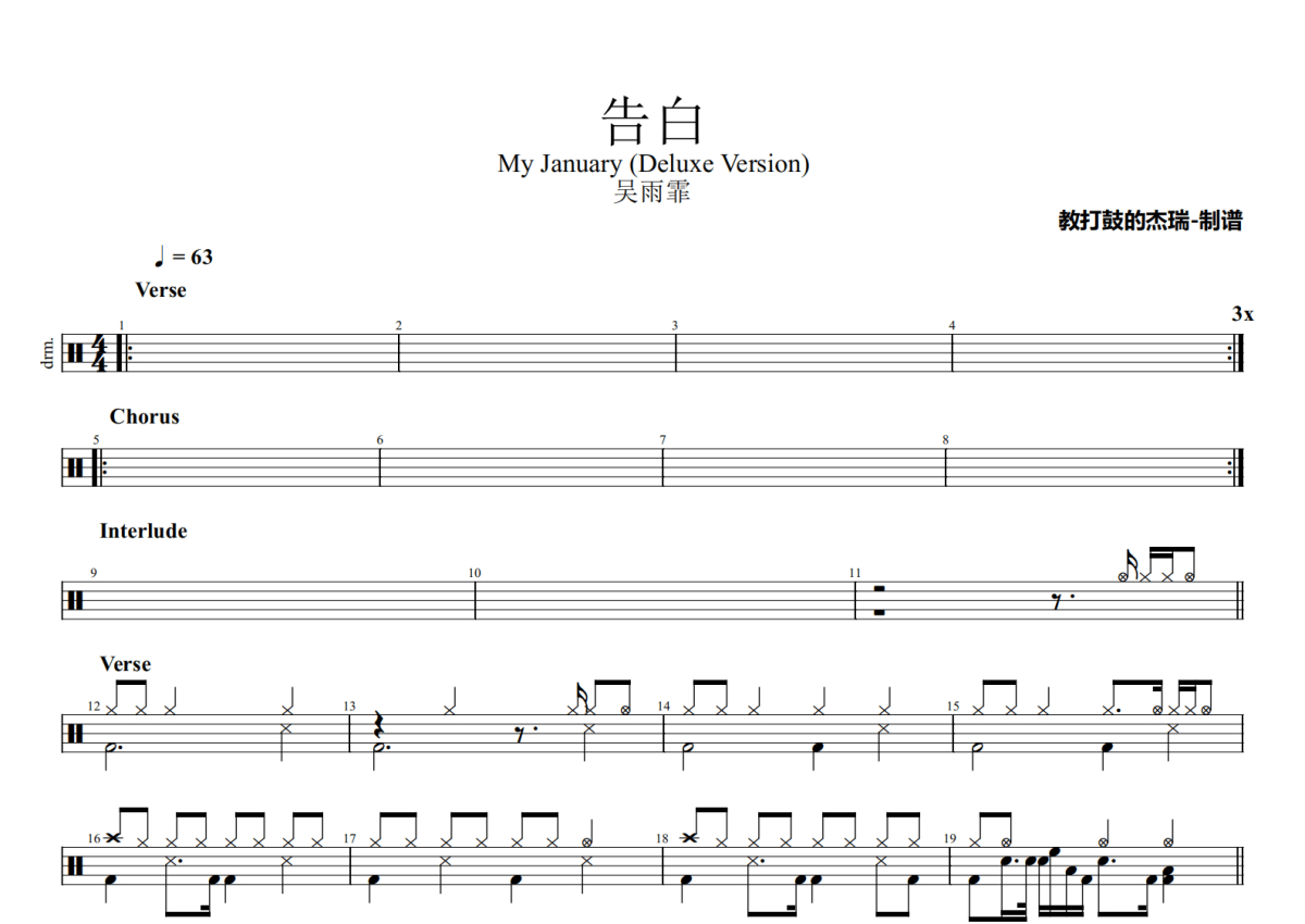 《告白》是吴雨霏演唱的一首歌曲,拍号为4/4拍,歌曲速度为每分钟63拍,这份架子鼓谱共有两张高清图谱,图谱由 @Jerry 编配上传,图谱使用五线谱编配,使用这份告白架子鼓谱,你将能够轻松地敲打出这首吴雨霏的告白,快来尝试吧。