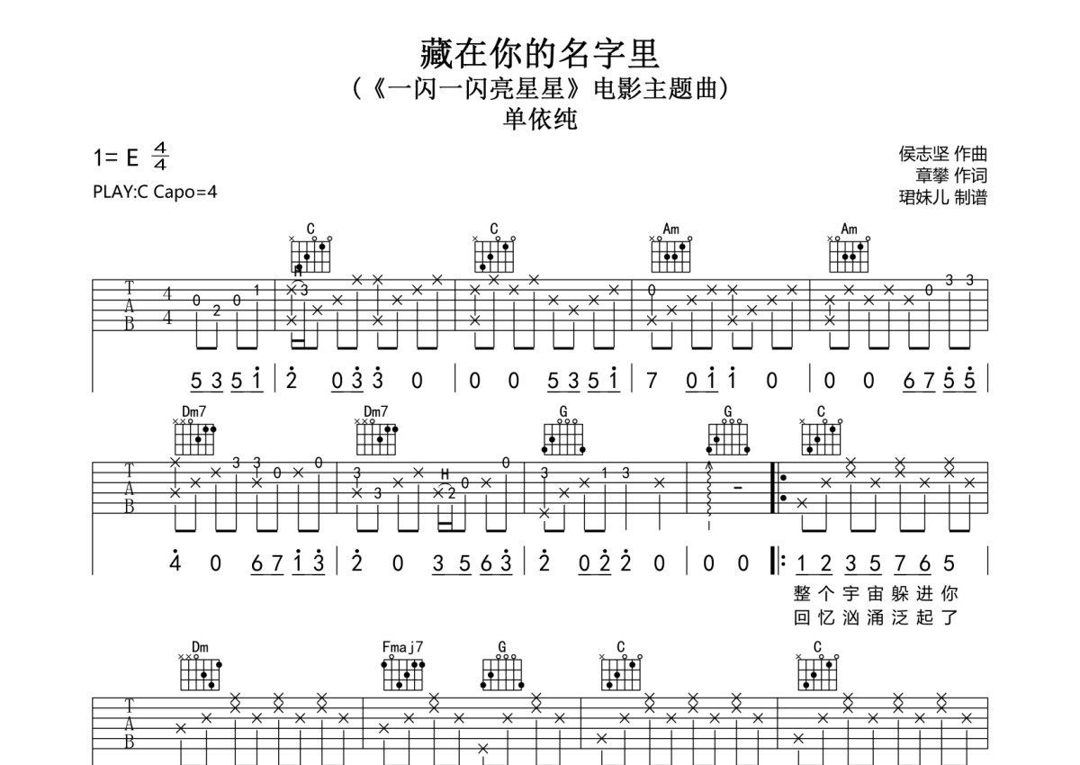 《藏在你的名字里》是单依纯演唱的一首歌曲,拍号为4/4拍,歌曲速度为每分钟85拍,歌曲原调为E调,但由于原调指法比较难,为了方便弹奏,本吉他谱采用的是C调指法编配,变调夹4品弹奏即为原调,当然也可以根据自己的音域改变变调夹位置,或者通过改变和弦调性,以方便自己弹奏,这份吉他谱共有两张高清图谱,图谱由 @珺妹儿 编配上传,图谱使用六线谱编配,包含吉他和弦指法、简谱以及歌词部分,使用这份藏在你的名字里吉他谱,可以让你更加方便地掌握这首歌曲的弹唱技巧,快来尝试吧。
