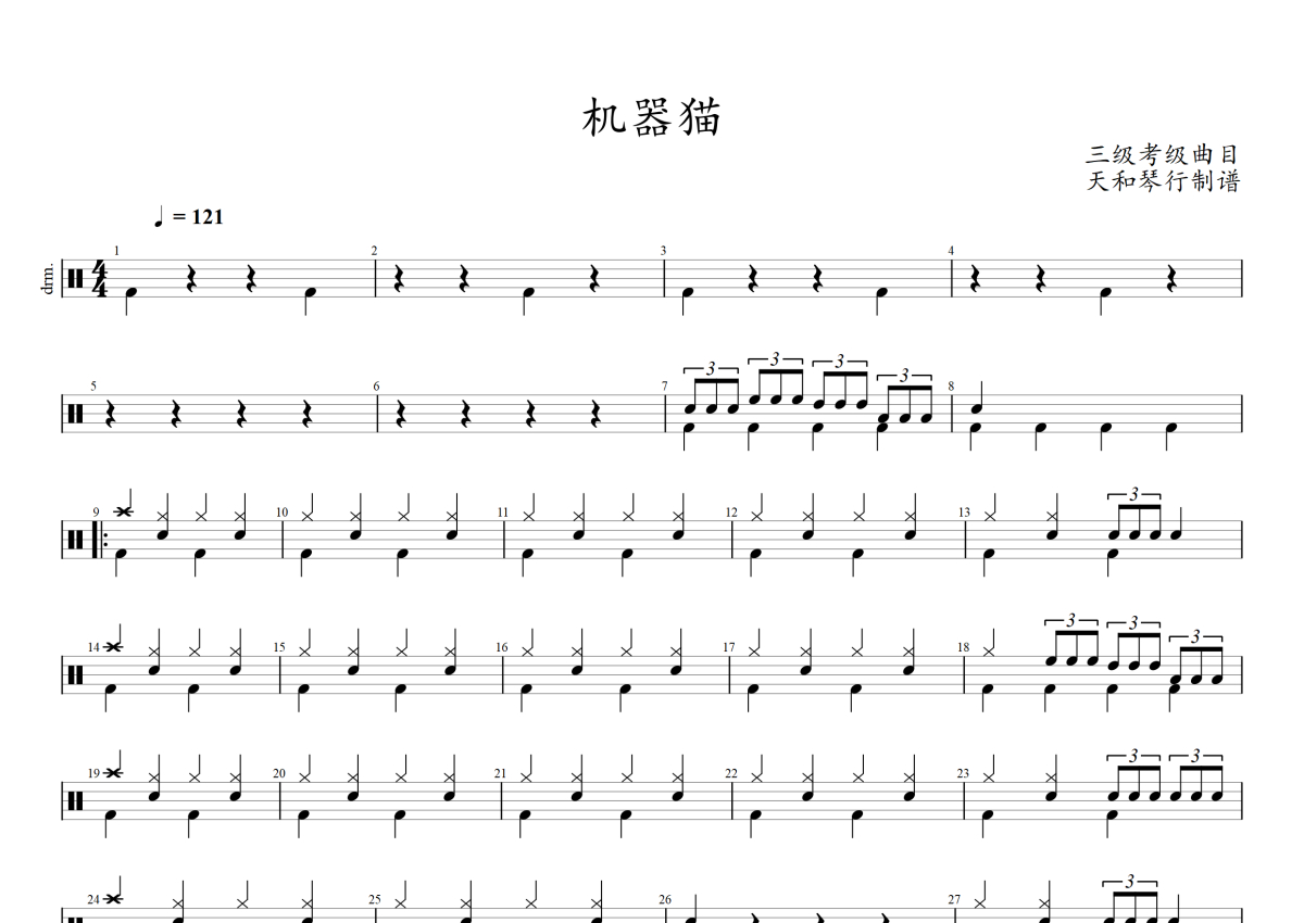 《机器猫》是三级考级曲目演唱的一首歌曲,拍号为4/4拍,歌曲速度为每分钟121拍,这份架子鼓谱共有两张高清图谱,图谱由 @音符喷血者 编配上传,图谱使用五线谱编配,使用这份机器猫架子鼓谱,你将能够轻松地敲打出这首三级考级曲目的机器猫,快来尝试吧。
