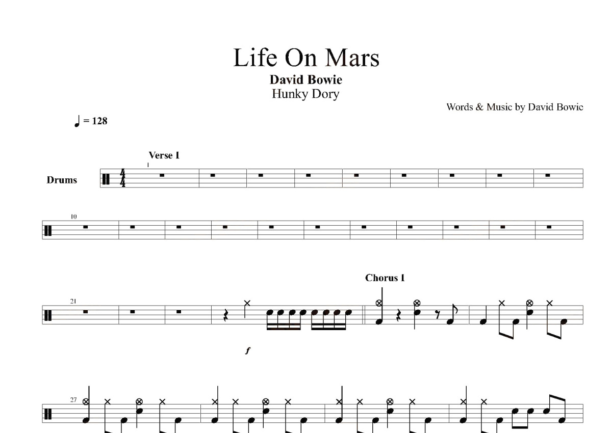 《Life On Mars》是David Bowie演唱的一首歌曲,这份鼓谱共有三张高清图谱,图谱由 @打鼓谱 编配上传,图谱使用五线谱编配,使用这份Life On Mars架子鼓谱,你将能够轻松地敲打出这首David Bowie的Life On Mars,快来尝试吧。《Life On Mars?》是英国已故摇滚歌手David Bowie演唱的歌曲,该歌曲收录于1971年12月17日发行的专辑《Hunky Dory》中,大卫·鲍伊(David Bowie,1947年1月8日-2016年1月10日),原名大卫·罗伯特·海伍德·琼斯(David Robert Haywood Jones),出生于英国伦敦布里克斯顿,英国摇滚歌手、演员。