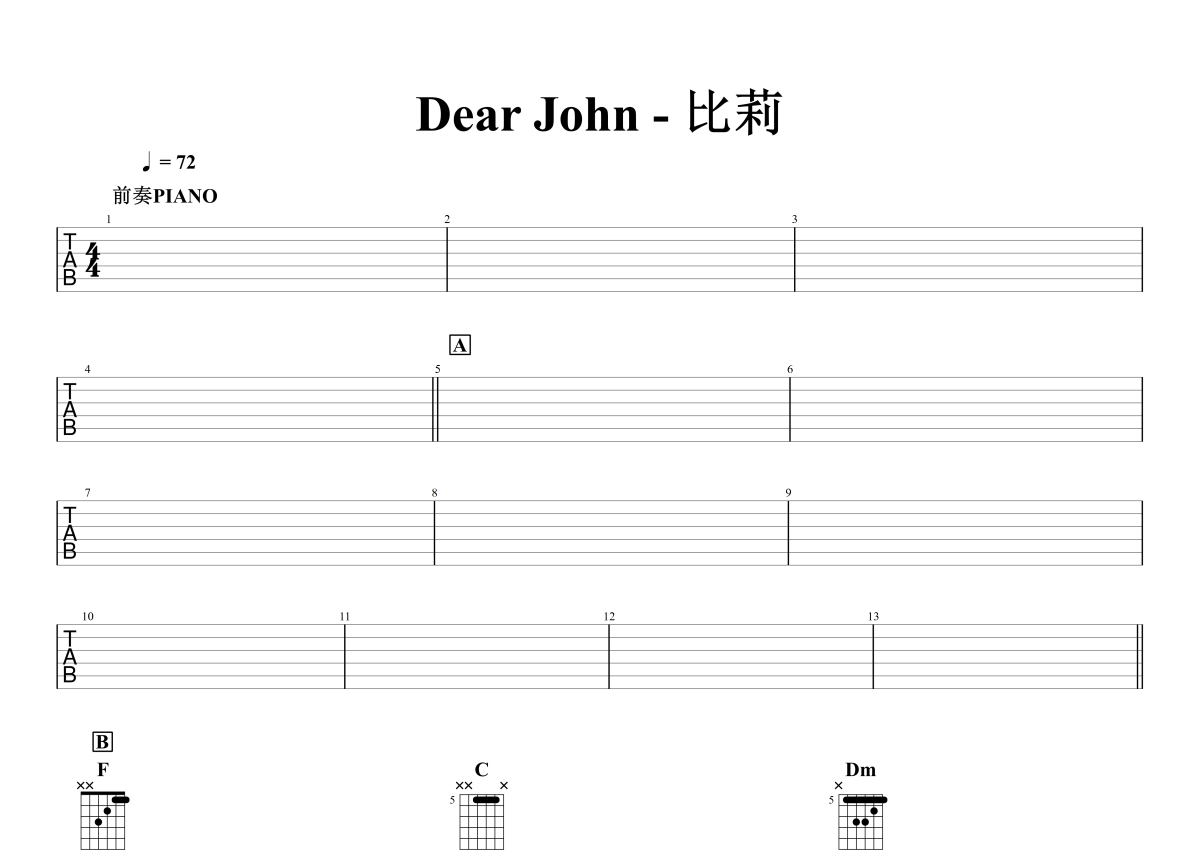《Dear John》是比莉演唱的一首歌曲,石头音乐原版记谱,拍号为4/4拍,歌曲速度为每分钟72拍,歌曲原调为F调,演奏时不需要使用变调夹即为原调,这份电吉他谱共有七张高清图谱,图谱由 @石头音乐 编配上传,图谱使用六线谱编配,曲谱配备了相关的音频提供试听,使用这份Dear John电吉他谱,可以让你更加方便地掌握这首歌曲的演奏技巧,快来尝试吧。完全歌曲详细电吉他谱,包含每个伴奏音符、经典SOLO、GTP文件。