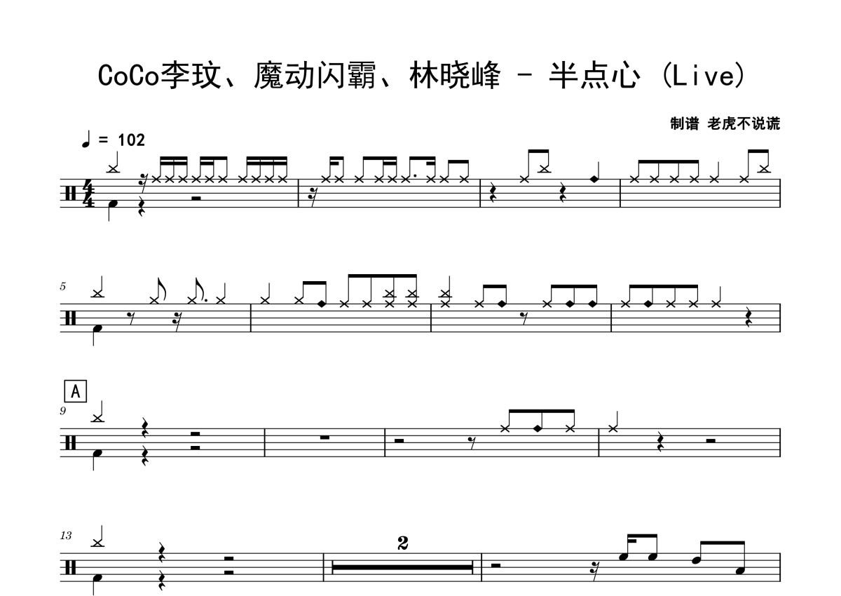 《半点心》是CoCo李玟、魔动闪霸、林晓峰演唱的一首歌曲,(Live),拍号为4/4拍,歌曲速度为每分钟102拍,这份架子鼓谱共有四张高清图谱,图谱由 @老虎不说谎 编配上传,图谱使用五线谱编配,使用这份半点心架子鼓谱,你将能够轻松地敲打出这首CoCo李玟、魔动闪霸、林晓峰的半点心,快来尝试吧。