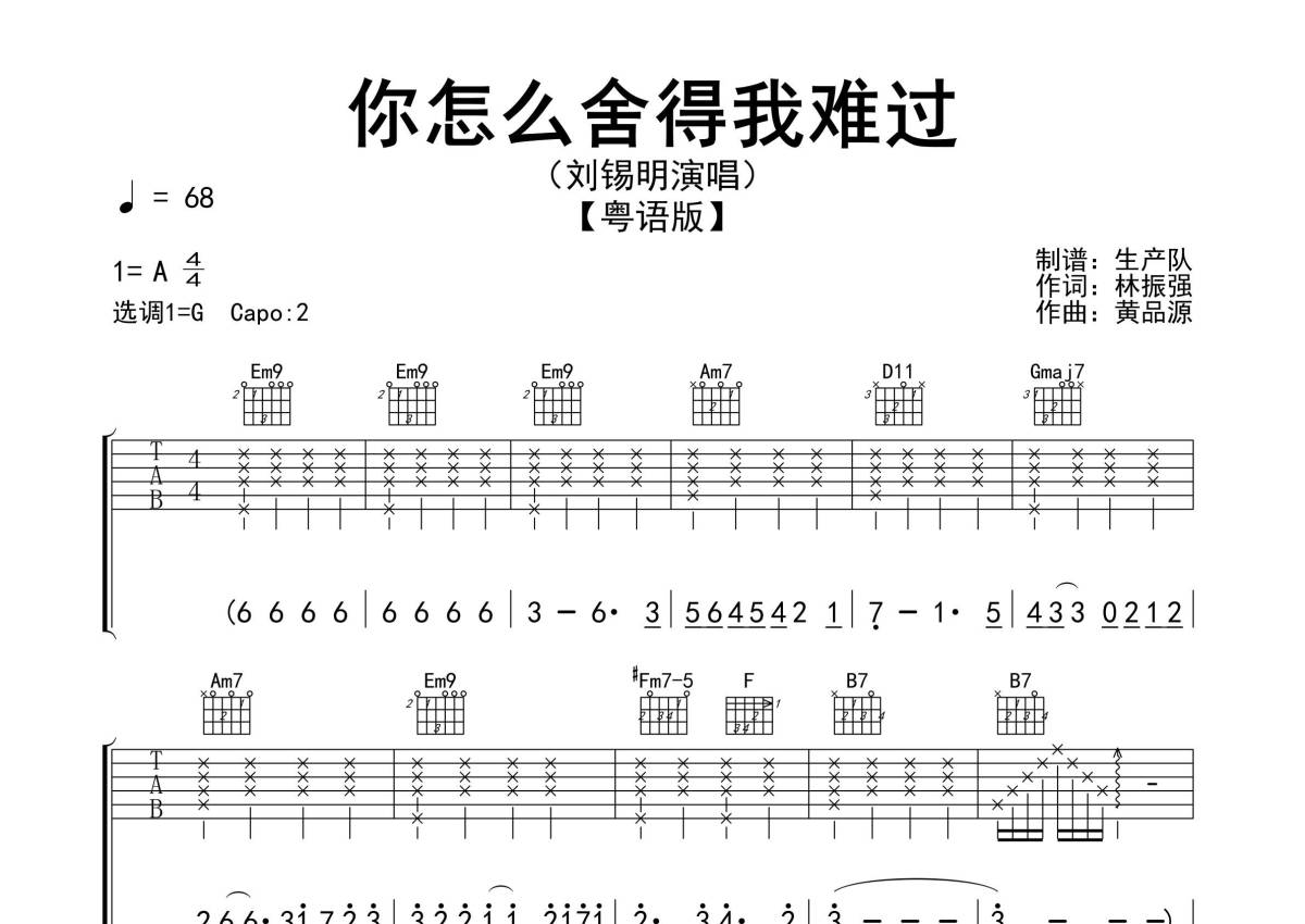《你怎么舍得我难过》是刘锡明演唱的一首歌曲,粤语版,拍号为4/4拍,歌曲速度为每分钟68拍,歌曲原调为A调,但由于原调指法比较难,为了方便弹奏,本吉他谱采用的是G调指法编配,变调夹2品弹奏即为原调,当然也可以根据自己的音域改变变调夹位置,或者通过改变和弦调性,以方便自己弹奏,这份吉他谱共有三张高清图谱,图谱由 @生产队 编配上传,图谱使用六线谱编配,包含吉他和弦指法、简谱以及歌词部分,使用这份你怎么舍得我难过吉他谱,可以让你更加方便地掌握这首歌曲的弹唱技巧,快来尝试吧。《你怎么舍得我难过》(粤语版)是刘锡明主唱的一首粤语歌曲,收录于1991年11月发行的专辑《How Can You Leave Me With》中。本吉他谱根据原版G调指法编配,完整的前奏、间奏、尾奏及SOLO编配,怀旧经典!。