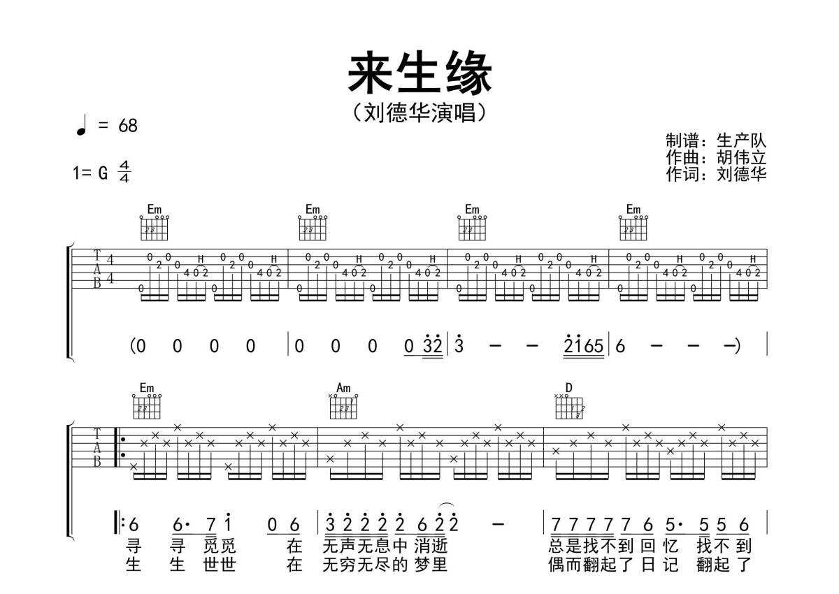 《来生缘》是完美版演唱的一首歌曲,精编完美版,拍号为4/4拍,歌曲速度为每分钟68拍,歌曲原调为G调,本吉他谱采用的是G调指法编配,演奏时不需要使用变调夹即为原调,这份吉他谱共有三张高清图谱,图谱由 @生产队 编配上传,图谱使用六线谱编配,包含吉他和弦指法、简谱以及歌词部分,使用这份来生缘吉他谱,可以让你更加方便地掌握这首歌曲的弹唱技巧,快来尝试吧。《来生缘》是由刘德华作词,胡伟立作曲,杜自持编曲,刘德华演唱的经典歌曲 ,收录于刘德华1991年12月9日发行的同名专辑《来生缘》中。本吉他谱根据原版G调指法编配,精准的前奏、间奏、尾奏及SOLO编配,致敬经典!。