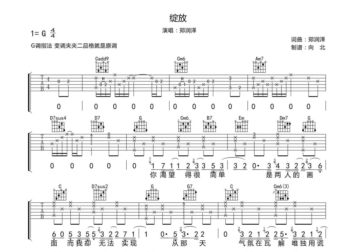 绽放吉他谱 - 郑润泽 - G调弹唱六线谱