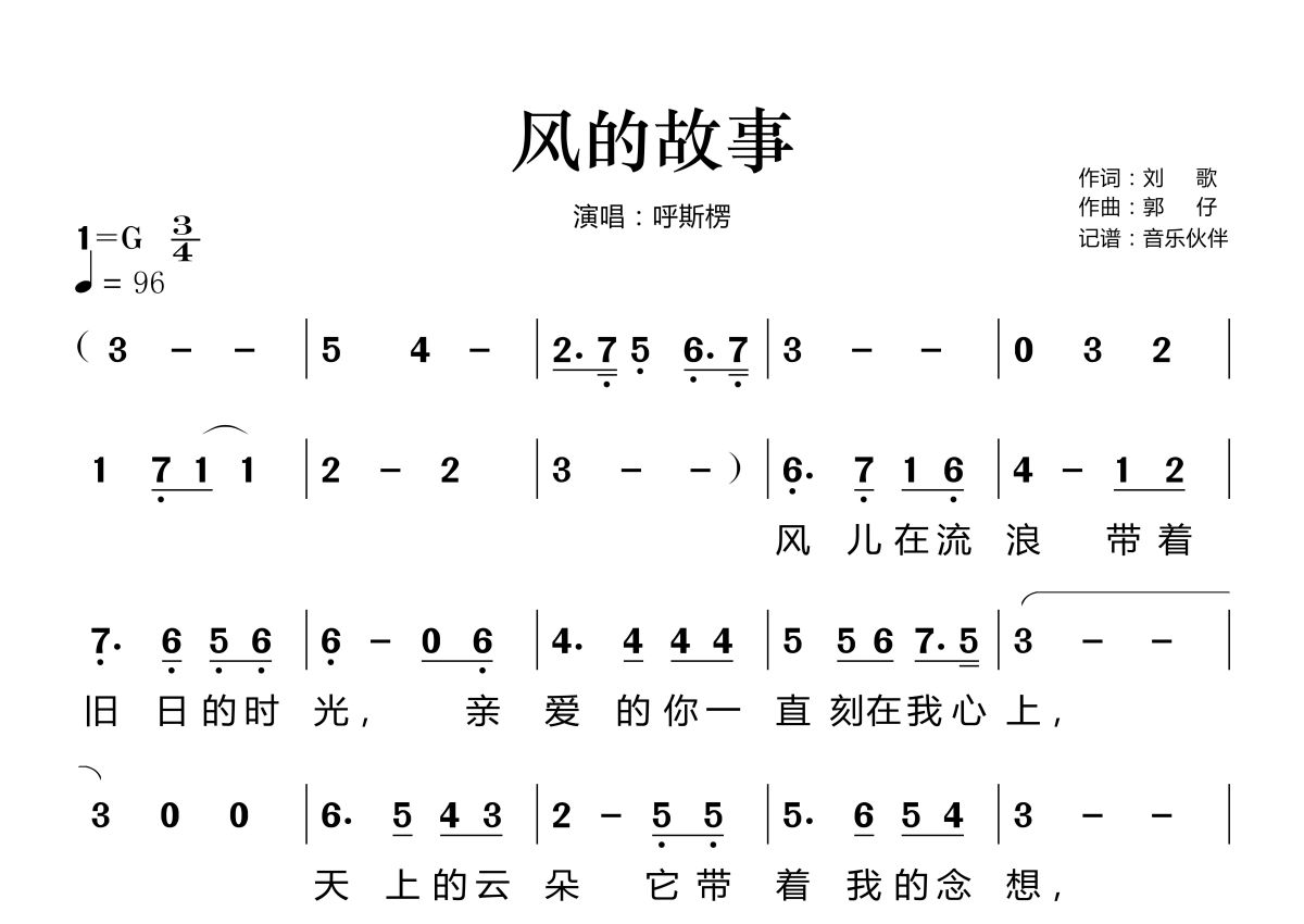 《风的故事》是呼斯楞演唱的一首歌曲,这份简谱共有两张高清图谱,图谱由 @音乐伙伴 编配上传。
