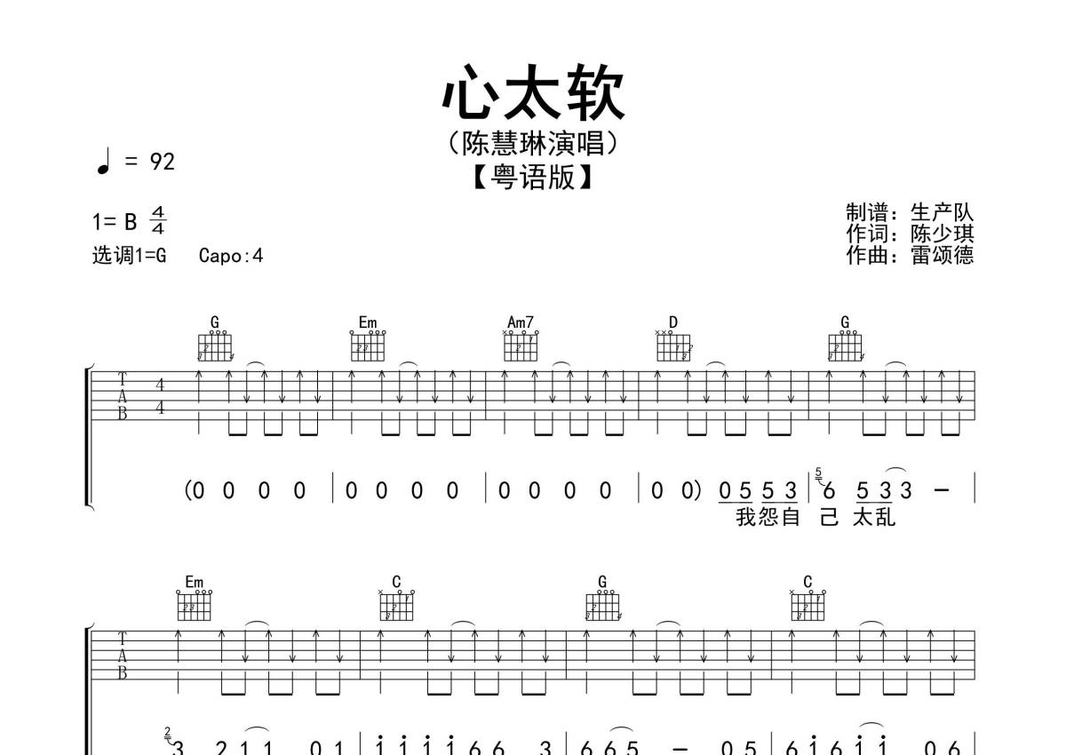 《心太软》是陈慧琳演唱的一首歌曲,精编扫弦版,拍号为4/4拍,歌曲速度为每分钟92拍,歌曲原调为B调,但由于原调指法比较难,为了方便弹奏,本吉他谱采用的是G调指法编配,变调夹4品弹奏即为原调,当然也可以根据自己的音域改变变调夹位置,或者通过改变和弦调性,以方便自己弹奏,这份吉他谱共有三张高清图谱,图谱由 @生产队 编配上传,图谱使用六线谱编配,包含吉他和弦指法、简谱以及歌词部分,使用这份心太软吉他谱,可以让你更加方便地掌握这首歌曲的弹唱技巧,快来尝试吧。《心太软》是1998年陈慧琳演唱的粤语歌曲,最早正东唱片在1997年12月20日发行的专辑《一出戏》。本吉他谱根据原版G调指法编配,完整的前奏、间奏、尾奏,扫弦节奏编配,怀旧经典!。