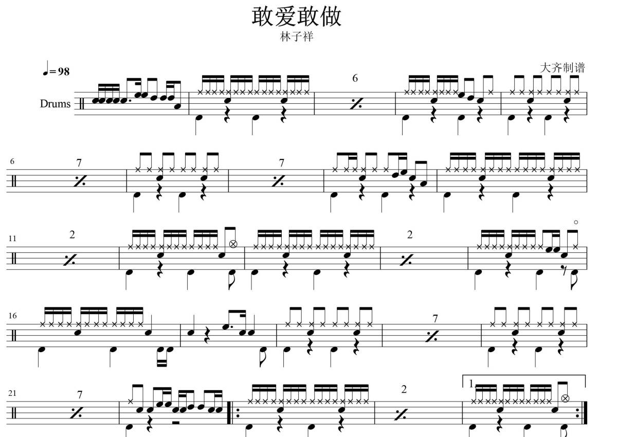 《敢爱敢做》是林子祥演唱的一首歌曲,拍号为4/4拍,歌曲速度为每分钟98拍,这份架子鼓谱共有一张高清图谱,图谱由 @大张齐鼓现代打击乐培训 编配上传,图谱使用五线谱编配,使用这份敢爱敢做架子鼓谱,你将能够轻松地敲打出这首林子祥的敢爱敢做,快来尝试吧。