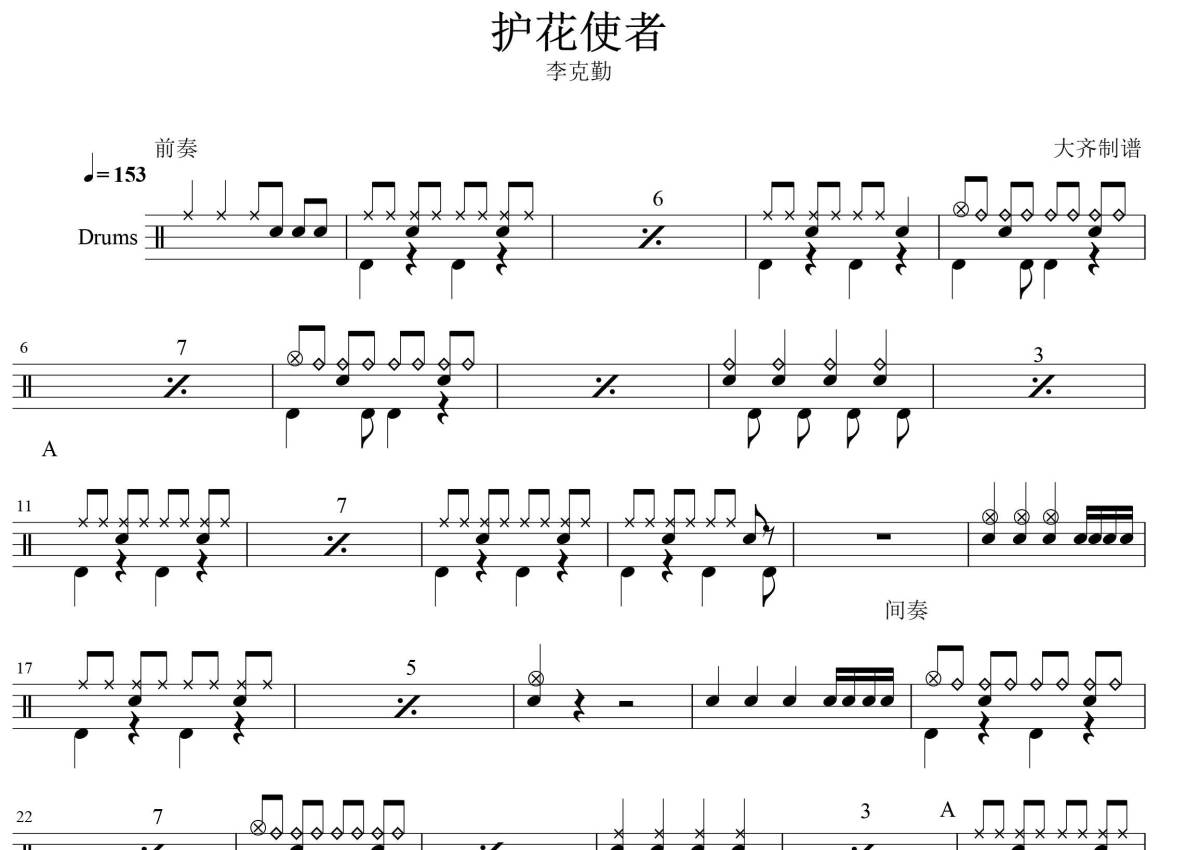 《护花使者》是李克勤演唱的一首歌曲,拍号为4/4拍,歌曲速度为每分钟153拍,这份架子鼓谱共有两张高清图谱,图谱由 @大张齐鼓现代打击乐培训 编配上传,图谱使用五线谱编配,使用这份护花使者架子鼓谱,你将能够轻松地敲打出这首李克勤的护花使者,快来尝试吧。