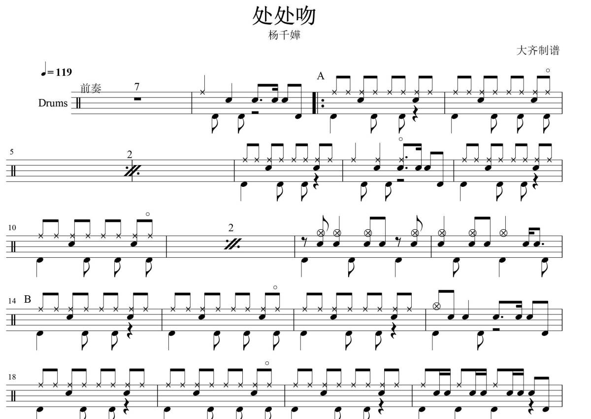 《处处吻》是杨千嬅演唱的一首歌曲,拍号为4/4拍,歌曲速度为每分钟119拍,这份架子鼓谱共有一张高清图谱,图谱由 @大张齐鼓现代打击乐培训 编配上传,图谱使用五线谱编配,使用这份处处吻架子鼓谱,你将能够轻松地敲打出这首杨千嬅的处处吻,快来尝试吧。