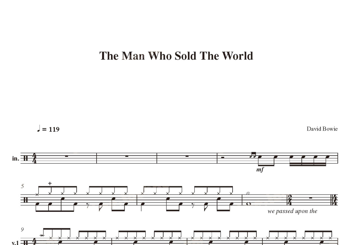 《The Man Who Sold The World》是David Bowie演唱的一首歌曲,这份鼓谱共有三张高清图谱,图谱由 @打鼓谱 编配上传,图谱使用五线谱编配,使用这份The Man Who Sold The World架子鼓谱,你将能够轻松地敲打出这首David Bowie的The Man Who Sold The World,快来尝试吧。《The Man Who Sold The World》是David Bowie演唱的歌曲,收录在2013年10月8日的专辑《Kurt Cobain About A Son: Music From The Motion Picture》中。大卫·鲍伊(David Bowie,1947年1月8日-2016年1月10日),原名大卫·罗伯特·海伍德·琼斯(David Robert Haywood Jones),出生于英国伦敦布里克斯顿,英国摇滚歌手、演员。