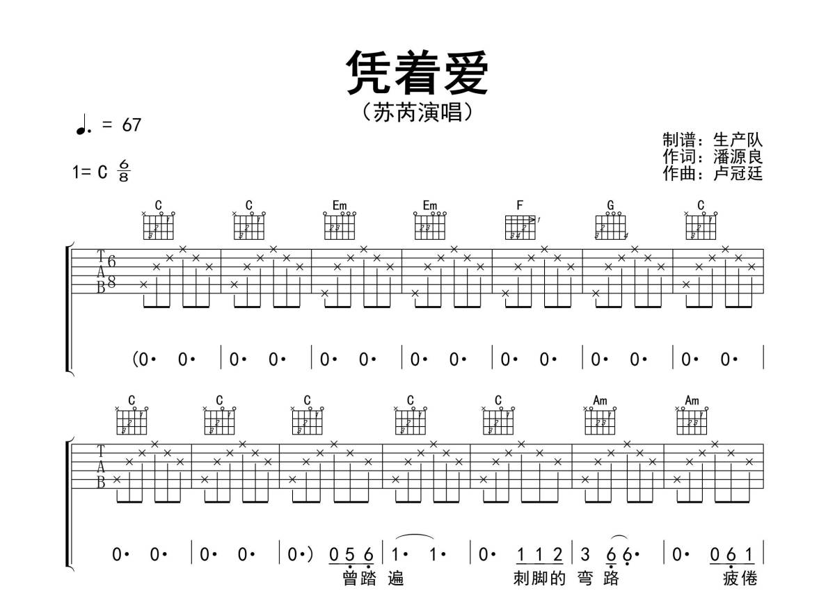 《凭着爱》是苏芮演唱的一首歌曲,精编完美版,拍号为6/8拍,歌曲速度为每分钟67拍,歌曲原调为C调,本吉他谱采用的是C调指法编配,演奏时不需要使用变调夹即为原调,这份吉他谱共有三张高清图谱,图谱由 @生产队 编配上传,图谱使用六线谱编配,包含吉他和弦指法、简谱以及歌词部分,使用这份凭着爱吉他谱,可以让你更加方便地掌握这首歌曲的弹唱技巧,快来尝试吧。《凭着爱》是苏芮演唱的粤语歌曲,由潘源良填词,卢冠廷谱曲,收录在苏芮1989年5月发行的粤语专辑《凭着爱》中。本吉他谱根据原版C调指法编配,完整的前奏、间奏编配,怀旧经典!。