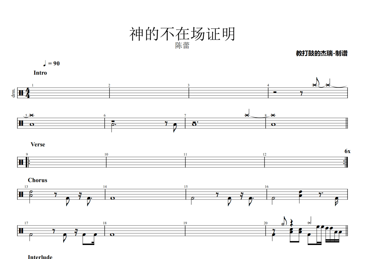 《神的不在场证明》是陈蕾演唱的一首歌曲,拍号为4/4拍,歌曲速度为每分钟90拍,这份架子鼓谱共有两张高清图谱,图谱由 @Jerry 编配上传,图谱使用五线谱编配,使用这份神的不在场证明架子鼓谱,你将能够轻松地敲打出这首陈蕾的神的不在场证明,快来尝试吧。
