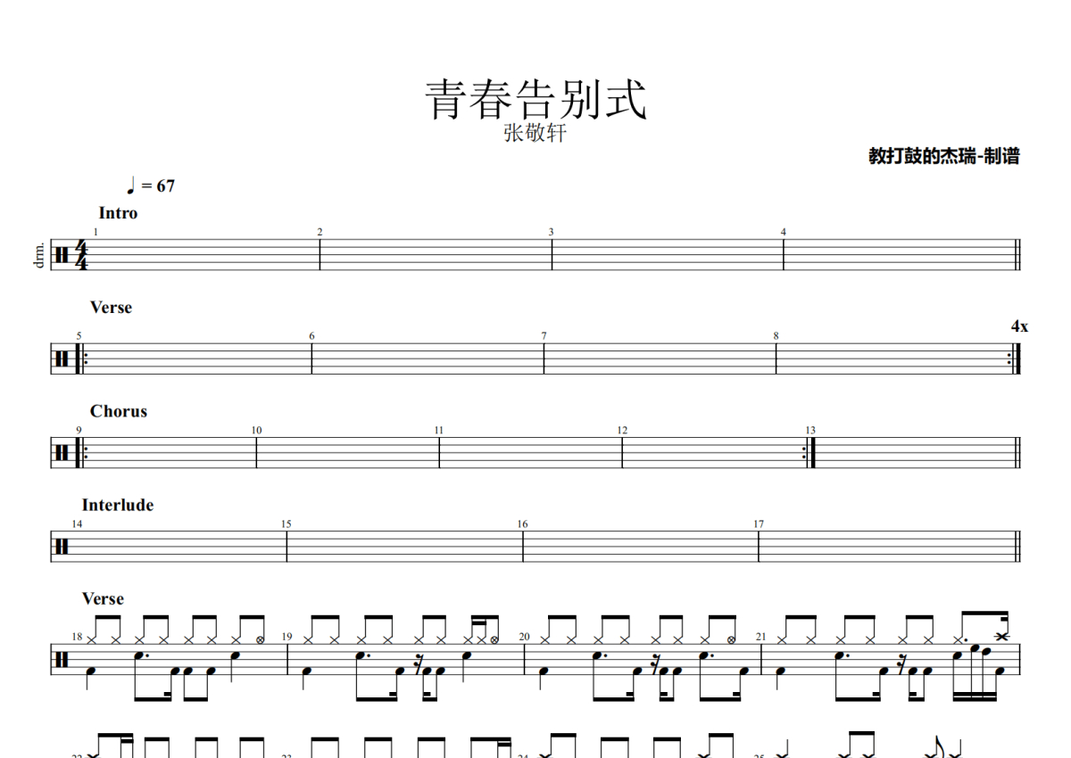 《青春告别式》是张敬轩演唱的一首歌曲,拍号为4/4拍,歌曲速度为每分钟67拍,这份架子鼓谱共有两张高清图谱,图谱由 @Jerry 编配上传,图谱使用五线谱编配,使用这份青春告别式架子鼓谱,你将能够轻松地敲打出这首张敬轩的青春告别式,快来尝试吧。