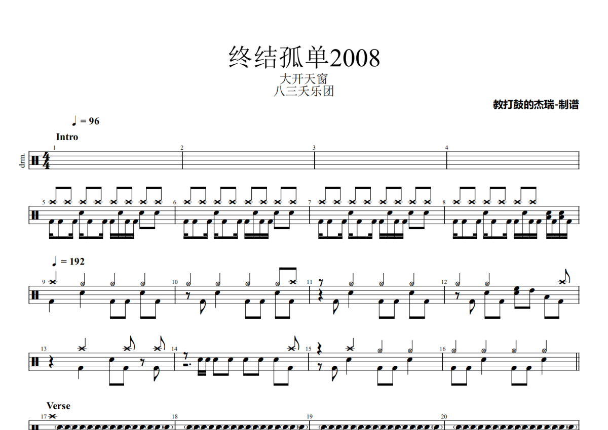 《终结孤单2008》是八三夭乐团演唱的一首歌曲,拍号为4/4拍,歌曲速度为每分钟96拍,这份架子鼓谱共有三张高清图谱,图谱由 @Jerry 编配上传,图谱使用五线谱编配,使用这份终结孤单2008架子鼓谱,你将能够轻松地敲打出这首八三夭乐团的终结孤单2008,快来尝试吧。