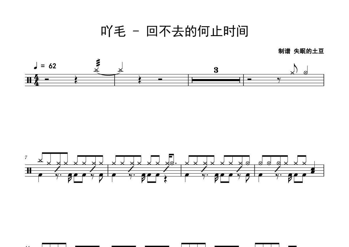 《回不去的何止时间》是吖毛演唱的一首歌曲,拍号为4/4拍,歌曲速度为每分钟62拍,这份架子鼓谱共有两张高清图谱,图谱由 @老虎不说谎 编配上传,图谱使用五线谱编配,使用这份回不去的何止时间架子鼓谱,你将能够轻松地敲打出这首吖毛的回不去的何止时间,快来尝试吧。