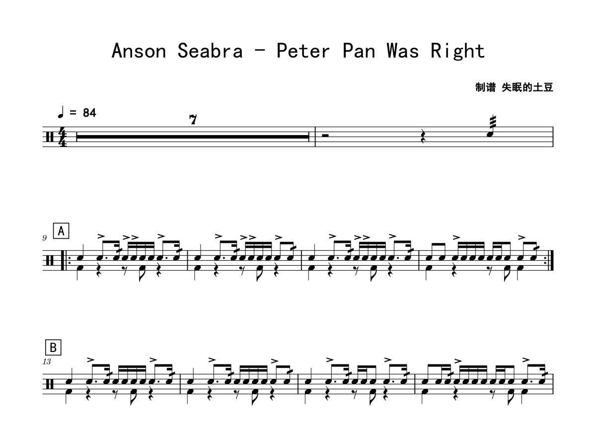 Anson Seabra《Peter Pan Was Right》架子鼓谱