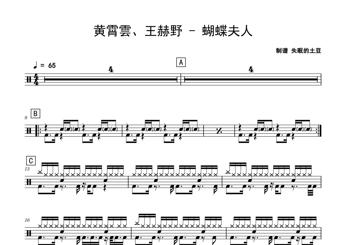 《蝴蝶夫人》是黄霄雲、王赫野演唱的一首歌曲,这份架子鼓谱共有两张高清图谱,图谱由 @老虎不说谎 编配上传,图谱使用五线谱编配,使用这份蝴蝶夫人架子鼓谱,你将能够轻松地敲打出这首黄霄雲、王赫野的蝴蝶夫人,快来尝试吧。