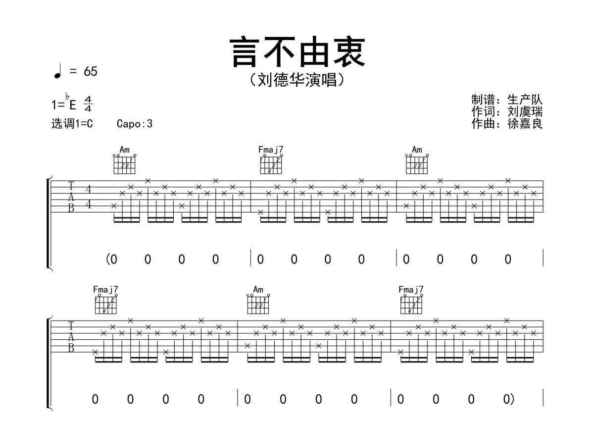 《言不由衷》是刘德华演唱的一首歌曲,精编民谣版,拍号为4/4拍,歌曲速度为每分钟65拍,歌曲原调为Eb调,但由于原调指法比较难,为了方便弹奏,本吉他谱采用的是C调指法编配,变调夹3品弹奏即为原调,当然也可以根据自己的音域改变变调夹位置,或者通过改变和弦调性,以方便自己弹奏,这份吉他谱共有三张高清图谱,图谱由 @生产队 编配上传,图谱使用六线谱编配,包含吉他和弦指法、简谱以及歌词部分,使用这份言不由衷吉他谱,可以让你更加方便地掌握这首歌曲的弹唱技巧,快来尝试吧。《言不由衷》是刘德华演唱的歌曲,由刘虞瑞作词,徐嘉良作曲,收录在刘德华1993年发行的专辑《真情难收》中。本吉他谱根据原版C调指法编配,完整的前奏、间奏、尾奏编配,怀旧经典!。