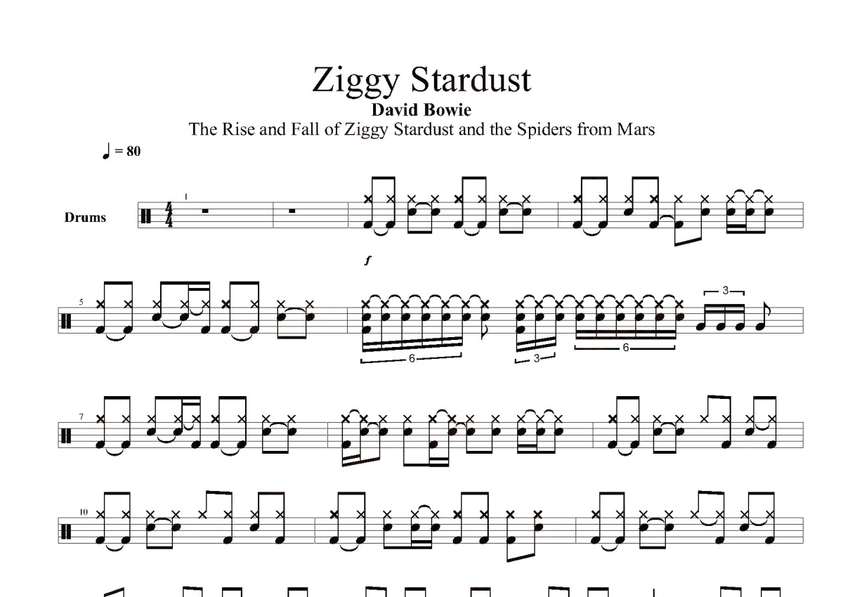《Ziggy Stardust》是David Bowie演唱的一首歌曲,这份鼓谱共有三张高清图谱,图谱由 @打鼓谱 编配上传,图谱使用五线谱编配,使用这份Ziggy Stardust架子鼓谱,你将能够轻松地敲打出这首David Bowie的Ziggy Stardust,快来尝试吧。《Ziggy Stardust》是David Bowie在1972年6月16日发行的一张专辑,是David Bowie的第五张专辑。全称为《The Rise and Fall of Ziggy Stardust and the Spiders from Mars》,《Ziggy Stardust》同时也是该专辑里的一首歌。大卫·鲍伊(David Bowie,1947年1月8日-2016年1月10日),原名大卫·罗伯特·海伍德·琼斯(David Robert Haywood Jones),出生于英国伦敦布里。