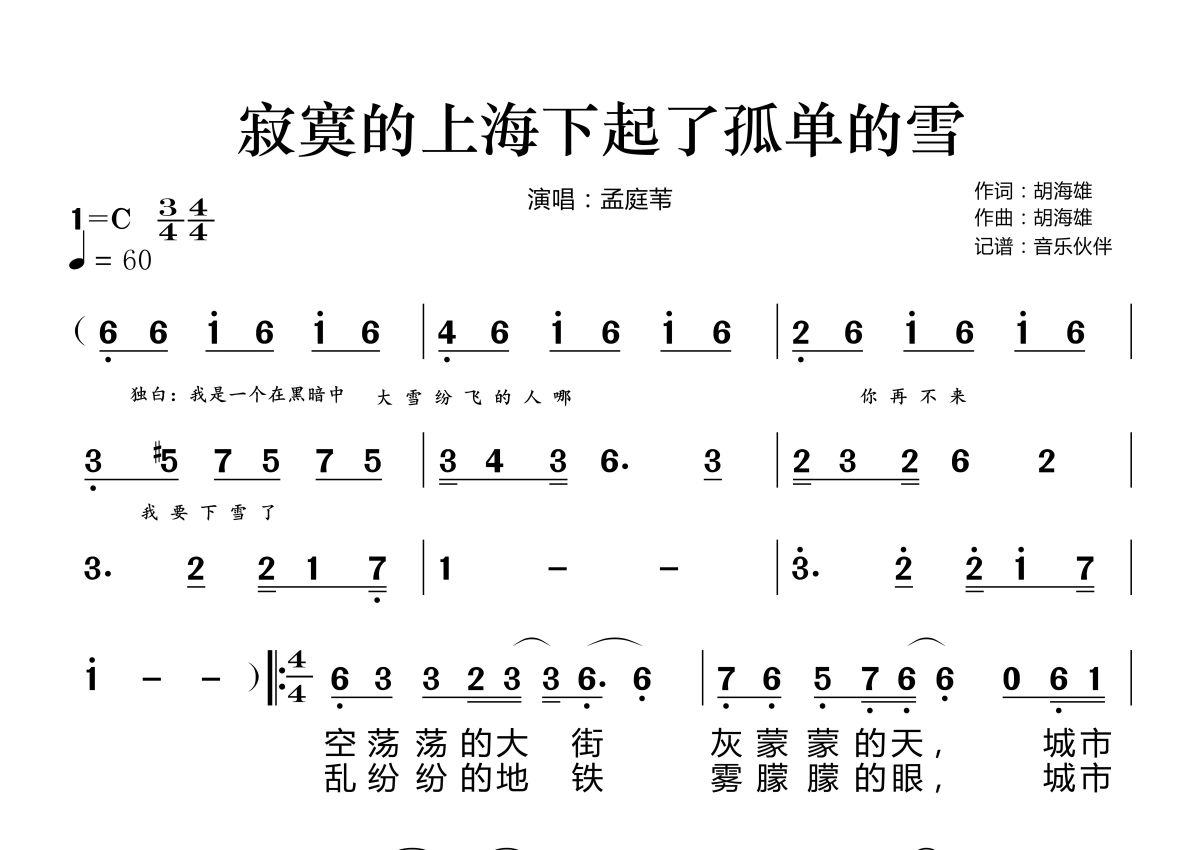 《寂寞的上海下起了孤单的雪》是孟庭苇演唱的一首歌曲,这份简谱共有两张高清图谱,图谱由 @音乐伙伴 编配上传。