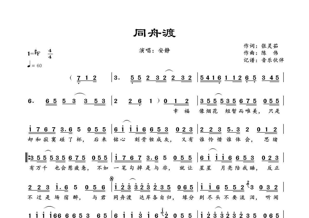 《同舟渡》是安静演唱的一首歌曲,拍号为4/4拍,歌曲速度为每分钟60拍,这份简谱共有一张高清图谱,图谱由 @音乐伙伴 编配上传。