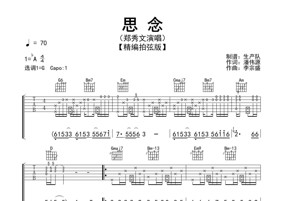 《思念》是郑秀文演唱的一首歌曲,精编拍弦版,拍号为4/4拍,歌曲速度为每分钟70拍,歌曲原调为Ab调,但由于原调指法比较难,为了方便弹奏,本吉他谱采用的是G调指法编配,变调夹1品弹奏即为原调,当然也可以根据自己的音域改变变调夹位置,或者通过改变和弦调性,以方便自己弹奏,这份吉他谱共有三张高清图谱,图谱由 @生产队 编配上传,图谱使用六线谱编配,包含吉他和弦指法、简谱以及歌词部分,使用这份思念吉他谱,可以让你更加方便地掌握这首歌曲的弹唱技巧,快来尝试吧。《思念》是郑秀文的演唱粤语歌曲,是《梦醒时分》的粤语版,李宗盛作曲,潘伟源填词。本吉他谱根据原版G调指法编配,精准的前奏、间奏、尾奏及SOLO编配,采用拍弦和切音技术编配,效果非常棒,致敬经典!。