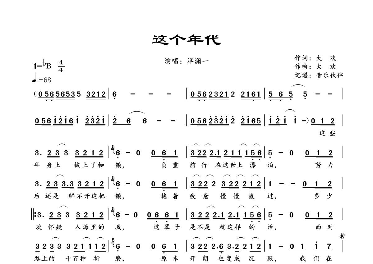 《这个年代》是洋澜一演唱的一首歌曲,拍号为4/4拍,歌曲速度为每分钟68拍,这份简谱共有一张高清图谱,图谱由 @音乐伙伴 编配上传。