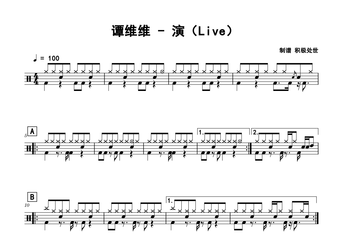 《演》是谭维维演唱的一首歌曲,拍号为4/4拍,歌曲速度为每分钟100拍,这份架子鼓谱共有三张高清图谱,图谱由 @老虎不说谎 编配上传,图谱使用五线谱编配,使用这份演架子鼓谱,你将能够轻松地敲打出这首谭维维的演,快来尝试吧。