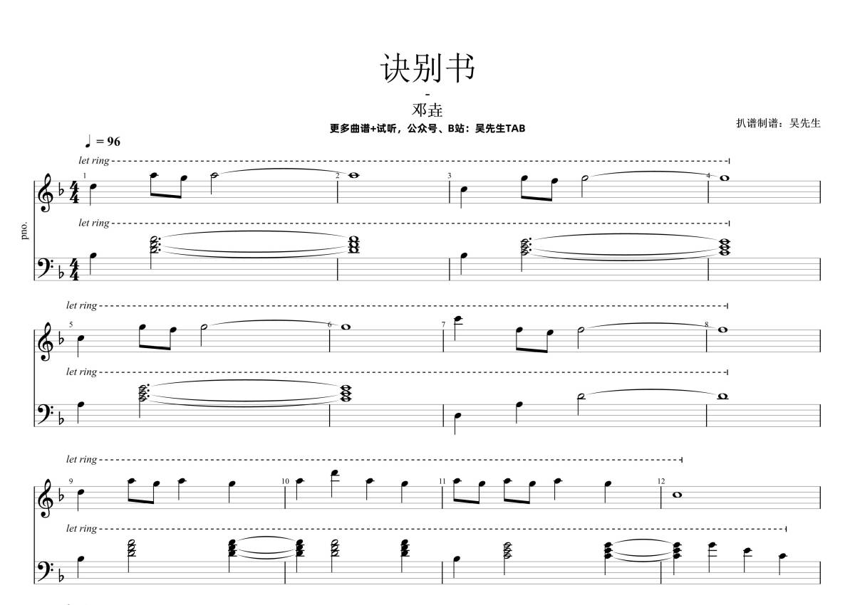 《诀别书》是邓垚演唱的一首歌曲,拍号为4/4拍,歌曲速度为每分钟96拍,这份钢琴谱共有四张高清图谱,图谱由 @吴先生TAB 编配上传,曲谱配备了相关的音频提供试听,使用这份诀别书钢琴谱,可以让你更加方便地掌握这首歌曲的演奏技巧,快来尝试吧。