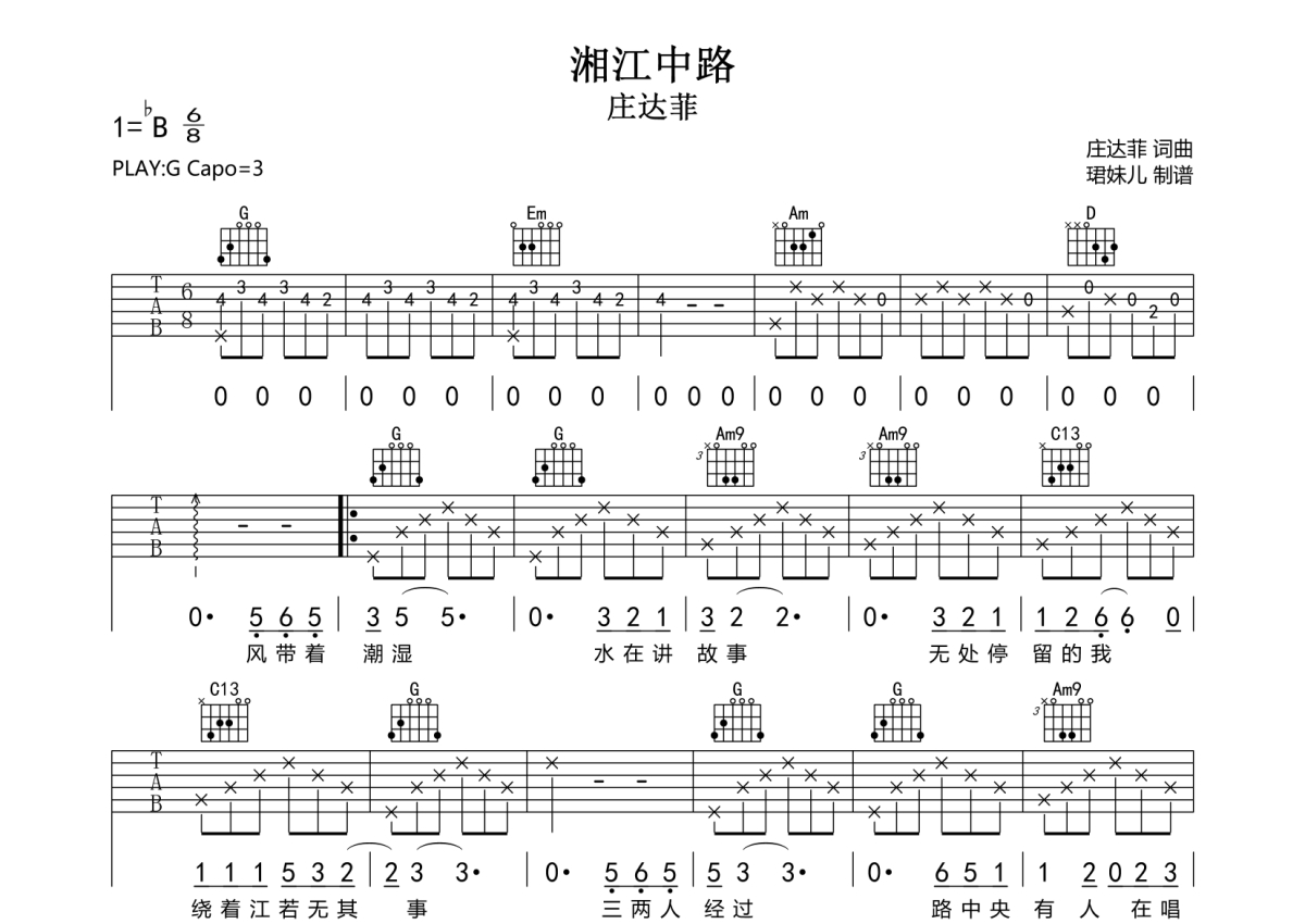庄达菲《湘江中路》吉他谱 - G调弹唱六线谱