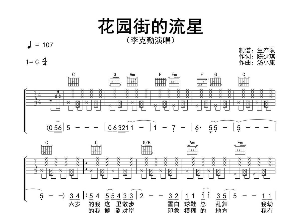 《花园街的流星》是李克勤演唱的一首歌曲,精编完美版,拍号为4/4拍,歌曲速度为每分钟107拍,歌曲原调为C调,本吉他谱采用的是C调指法编配,演奏时不需要使用变调夹即为原调,这份吉他谱共有三张高清图谱,图谱由 @生产队 编配上传,图谱使用六线谱编配,包含吉他和弦指法、简谱以及歌词部分,使用这份花园街的流星吉他谱,可以让你更加方便地掌握这首歌曲的弹唱技巧,快来尝试吧。《花园街的流星》是李克勤演唱的粤语歌曲,由陈少琪作词,汤小康作曲,收录于李克勤2002年5月29日发行专辑《Let's Celebrate》中。本吉他谱根据原版C调指法编配,完整的前奏、间奏、尾奏编配,拍弦节奏,致敬经典!。